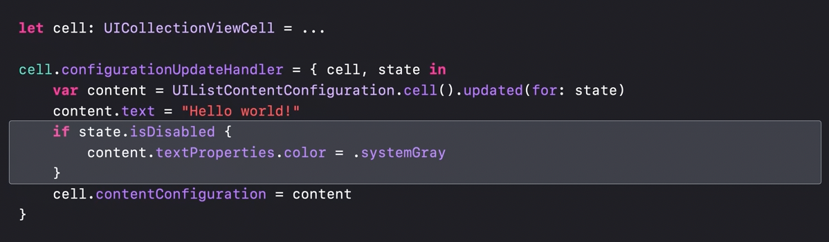 It's not necessary anymore to subclass system cells - configurationUpdateHandler lets us hook into state updates and update the cell's appearance. This fits well with the contentConfiguration and backgroundConfiguration of the cell - which again, make configuring cells as declarative as it can get in UIKit ๐ And of course, this is available for both UITableView and UICollectionView.