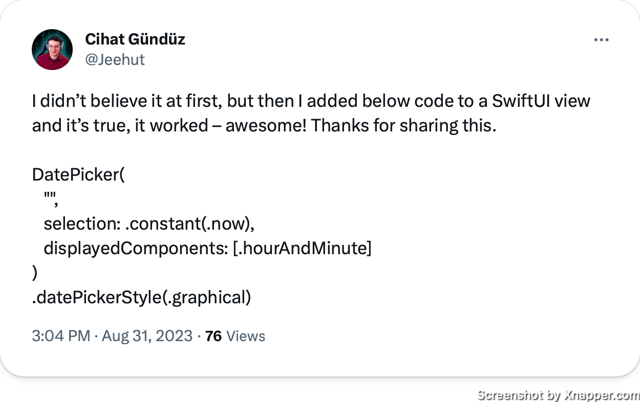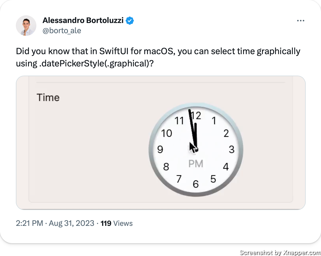 Apparently, DatePicker on macOS can be fun, where the user can move clock hands to select a time 🙈