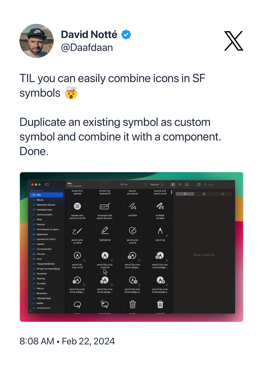 Check out the video in this tweet - I had no idea it's possible to combine two SF symbols into one by drag and dropping them together. And if you're not yet using the SF Symbols app, here it is