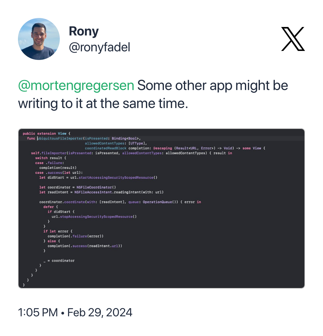 NSFileCoordinator.coordinate(with:queue:byAccessor:)so the access doesn't conflict with another app writing to the file at the same time.